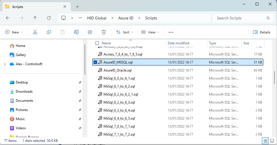 1. On the PC with Asure ID installed, locate the SQL Server script for creating the AsureID databases, this is located under C:\Program Files (x86)\HID Global\Asure ID\Scripts and will be named AsureID_MSSQL.sql If required, copy this file onto the server you wish to centrally manage the AsureID database.