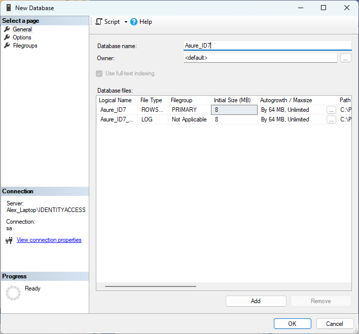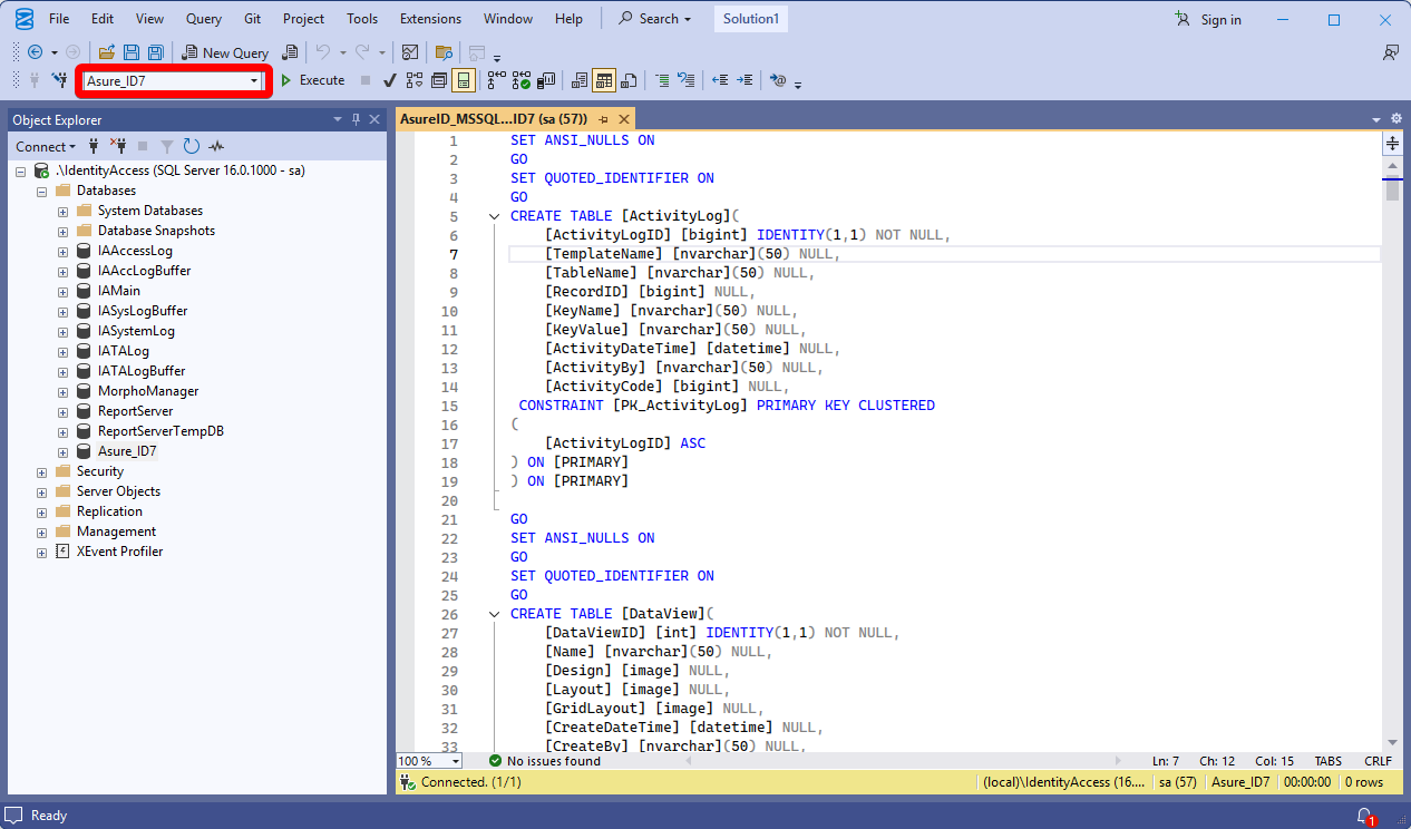 5. Load the AsureID_MSSQL.sql script. Select Asure_ID7 at the top and press Execute