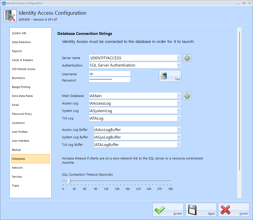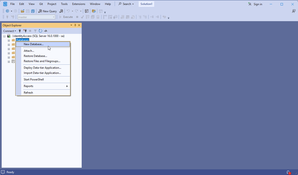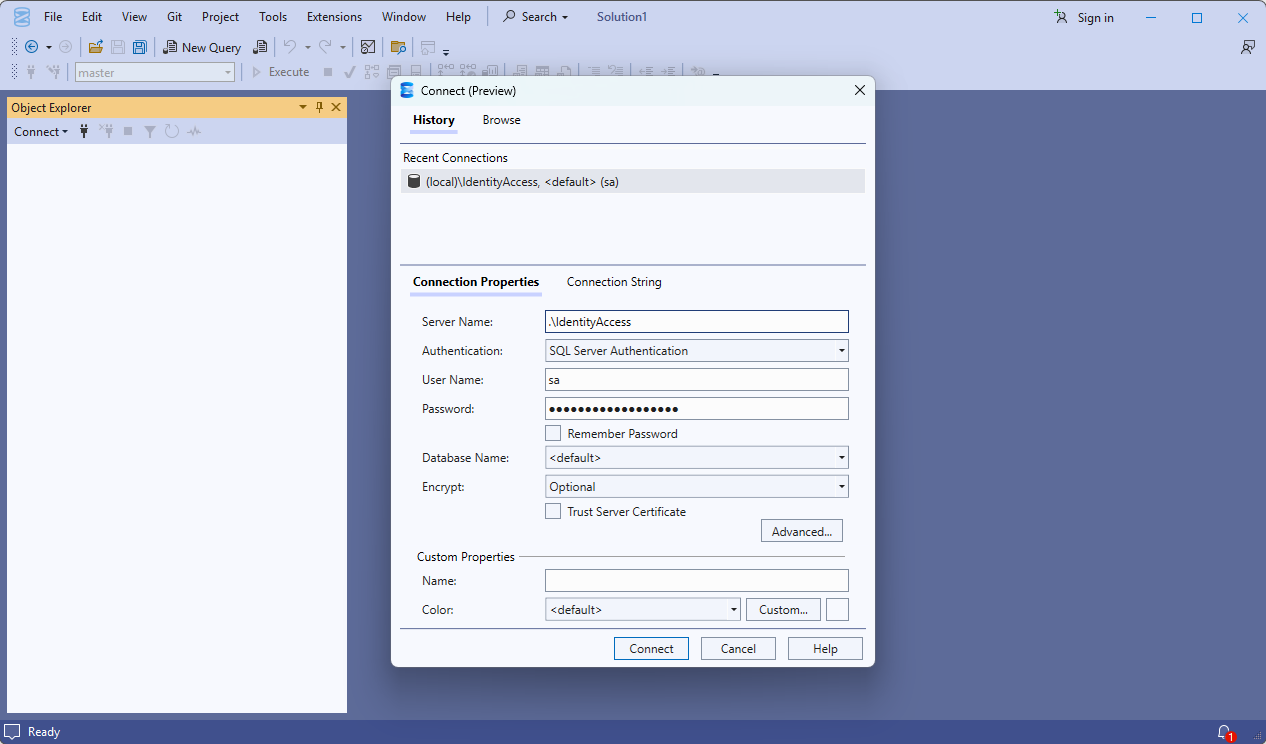 2. On the Identity Access server, load Microsoft SQL Server Management Studio and log in to the Identity Access instance. The following are the default credentials for the Identity Access instance: