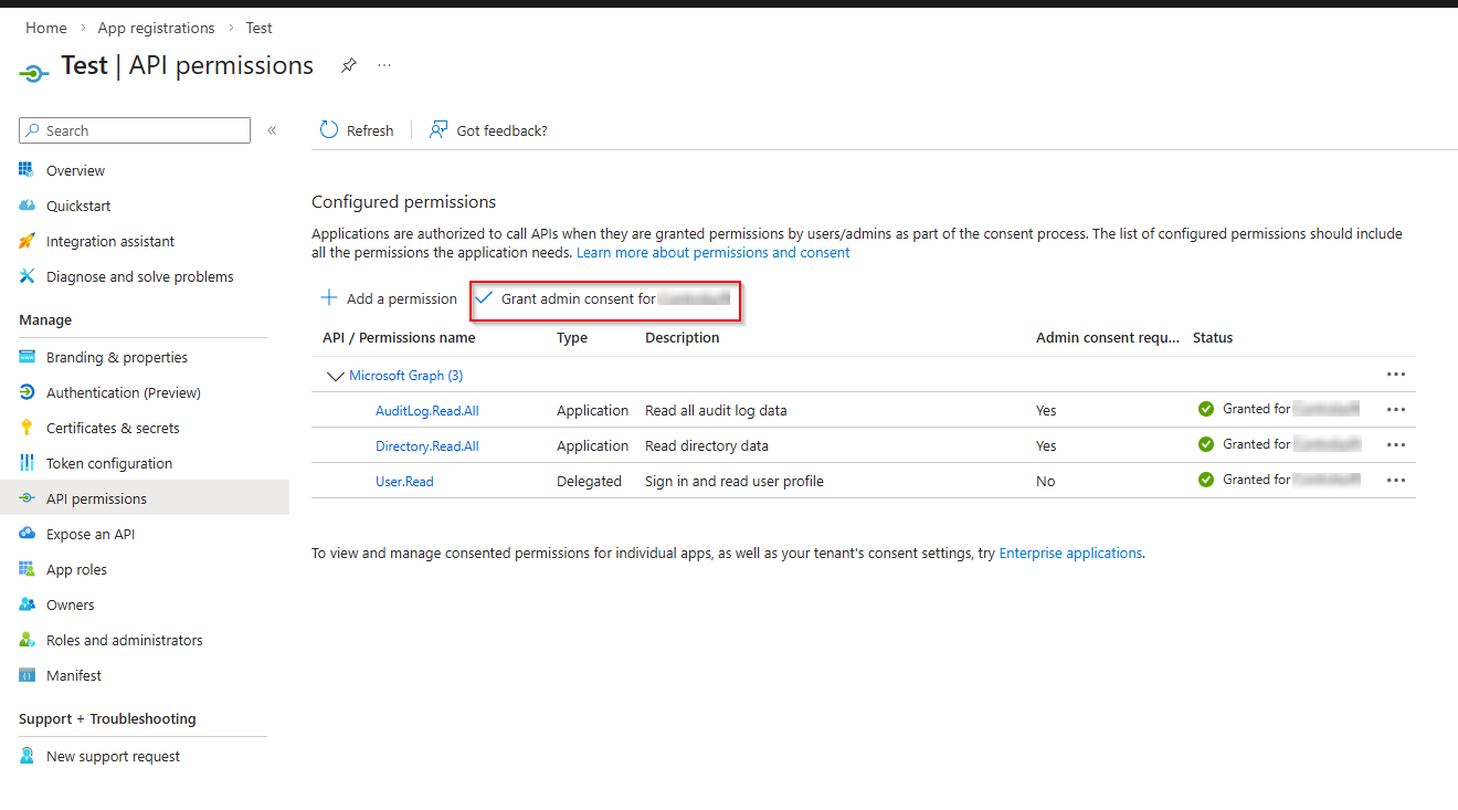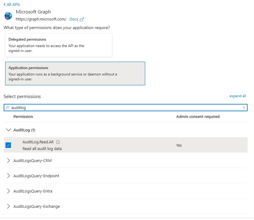 All' and 'AuditLog.Read.All' from Microsoft Graph (User Read should be there already). Select 'Add Permission' to these permissions.