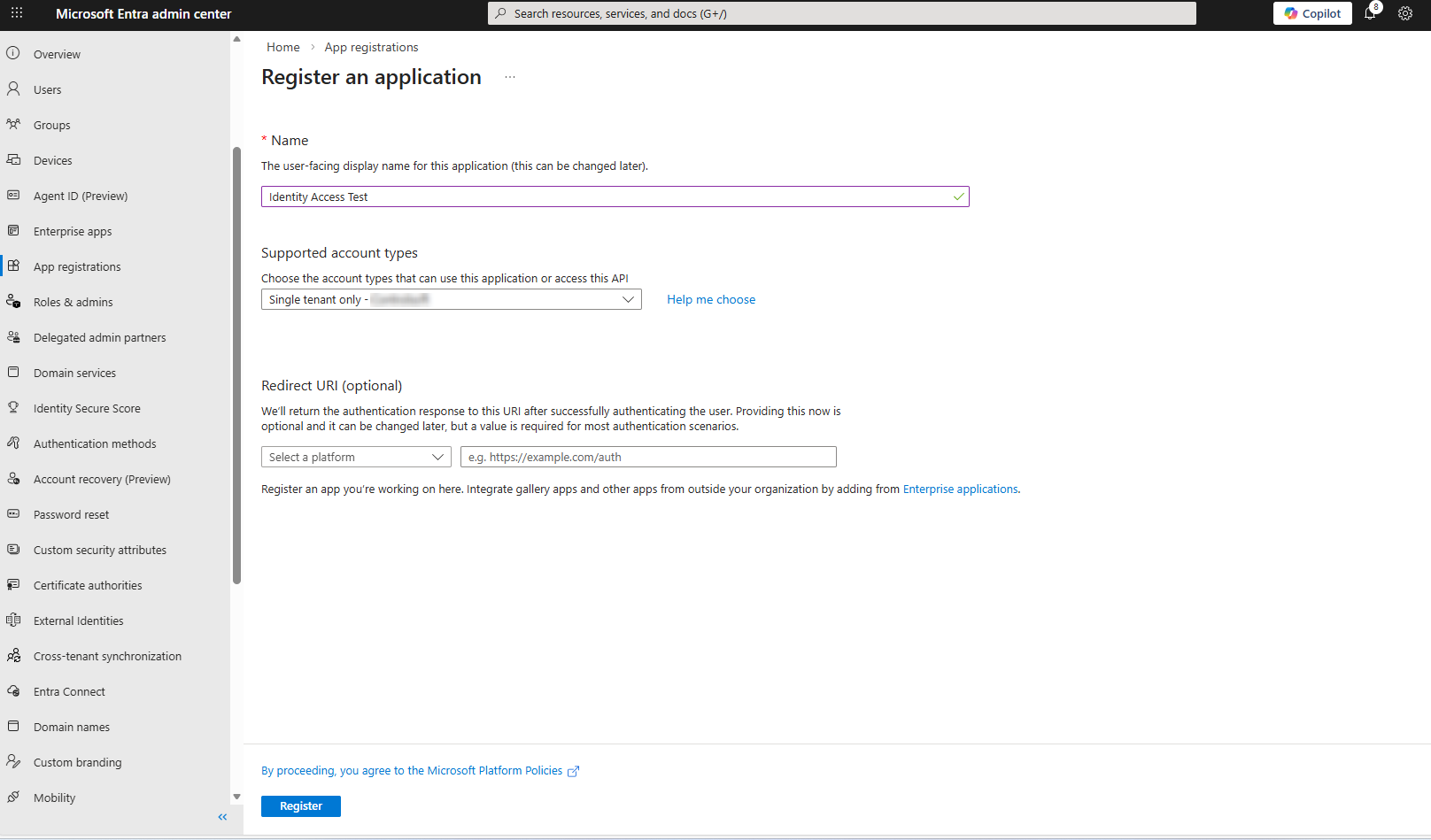 create an application (for this organisational directory only):