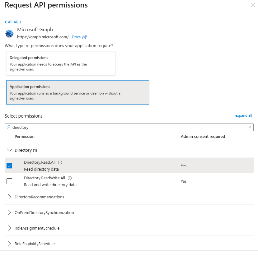 4. In the app, under the API permissions, add 'Directory Read