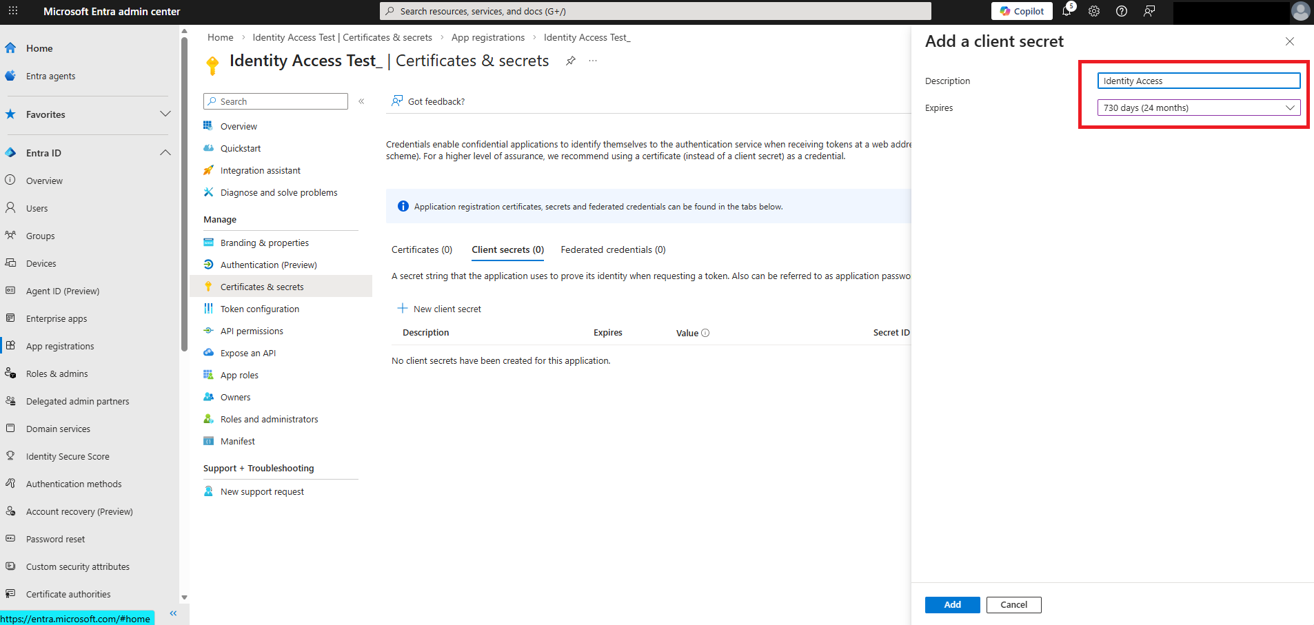 7. Create a secret (in the example below, the validity period is 2 years - the secret will have to be renewed after that time).