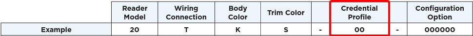 The HID Signo part numbers all run on the same basis. Below you can see how these part numbers are arranged and where the credential profile can be found within the part number.